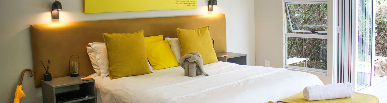 King or Twin beds, en-suite bathroom with yellow basin and rain shower. The bright yellow sliding wardrobe with full length mirror keeps you smiling!